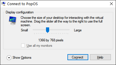 Once that completes, we can restart our Pop VM, and you should be prompted to set resolution and login with the new enhanced session.